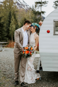 This styled elopement is hitting the blog today! My friends, Zoya (Zoya Dawn) and Chelsa (Chelsa J Photography) and I threw on this fun, easy styled elopement with the hopes of capturing something different and simple and the results are f*cking mind blowing! It was a cold rainy and very windy day. I had just flown in from Seattle which was to be a sunny 81 degree day to a 47 degree rain fest in Alaska. I hadn't been back since July 2018 so it was a nice little welcome back for me. I hadn't realized how 1 year away from Alaska had made me such a wuss. Well anyways, the shoot went amazing. Couple Dani and Jesse joined us for some fun and were serious troopers. Dani's rainbow hair matched the blankets and the florals by Flower Flingers. I found this amazing eclectic dress on Fashion Nova and it fit her like a glove. Zoya's sister, Zanna revamped an adorable photobooth Camper called 'Myrna' and you can find her and hire her for your own Alaskan wedding on insta (@phototrailerak)! It seriously is the perfect thing to have at any wedding! Dani and Jesse were absolutely amazing and so easy to work with! They actually weren't our original couple and when plans fell through, they stepped up last minute and it was meant to be. You will understand when you see these. Jesse wore a classic taupe suit and was so tender and loving to Dani. Dani has the most perfect smile- laugh that any photographer dreams of photographing and I am just so happy and content with images I got. Here you go: