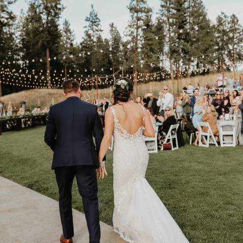 Lawrence and Madison's stunning September wedding is hitting the blog! Finally! It took place at thee most gorgeous wedding venue, Settler's Creek in CDA, Idaho. I was only 6 weeks postpartum when I shot this I might add, so yes, I am extremely dedicated to my brides and grooms! There was NO WAY I was missing this regal affair. Madison is a friend of mine, and a lot of the attendants are good friends of mine so it was so much fun! Madison wore a absolutely STUNNING Essense of Australia gown from Honest in Ivory in Spokane. The girls got ready in the most adorable bridal suite with a full spread of the snacks and drinks. I've never seen a venue take care of their clients like that. Once Madi had hair and makeup done, we did a first look with her father. This first look absolutely slayed me. I've never seen a father, tall and composed turn to mush like that at the site of his little girl in her wedding gown. The whole family was watching and once they had their moment, they all were brought in for a giant bear hug. It was so precious.